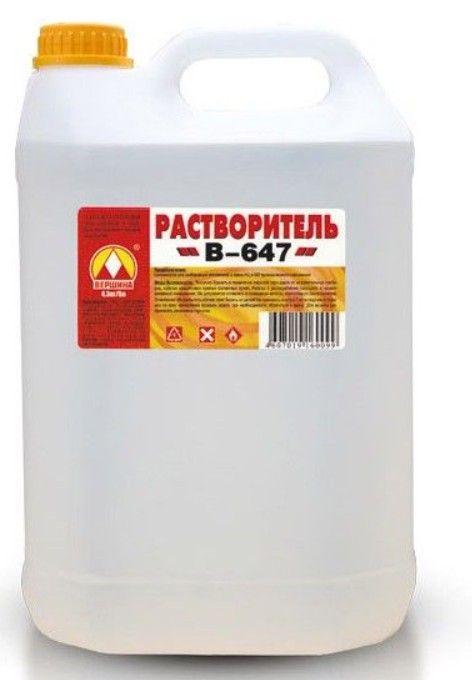 Растворитель 647 в своём составе имеет летучие вещества органического происхождения: эфиры, спирты, ароматические углеводороды и кетоны. А это 41,3% толуола; 29,8% бутилацетата; 21,2% этилацетата и 7,7% бутанола. Из-за отсутствия в составе этилцеллозольва и ацетона обладает менее агрессивным воздействием, чем у растворителя 646. Поэтому его использование оправдано в тех случаях, когда поверхность очень чувствительна.